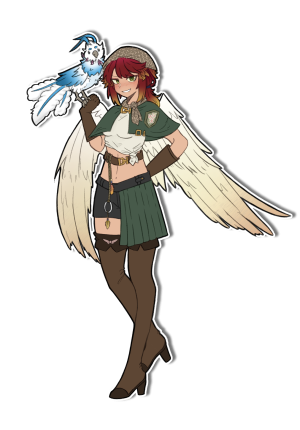 A woman who stands on the taller side of the Featherfolk height range, she has dark red-auburn hair that tapers into an orange color at the tips. Similarly orange-colored feathers also sprout from her head, nestled underneath her hair but are still visible. She has bright lime eyes, always seemingly smug or tired. Her wardrobe often consists of a headscarf, neckerchief, shirts that reveal her abdomen, short-shorts with a half-skirt, and long thigh-high leather boots with elbow-length gloves to match. Her white wings fade into a darker orange-gold color at the tips of the feathers, and they are often stained a little bit with dirt due to her profession as a peerkokeeper.