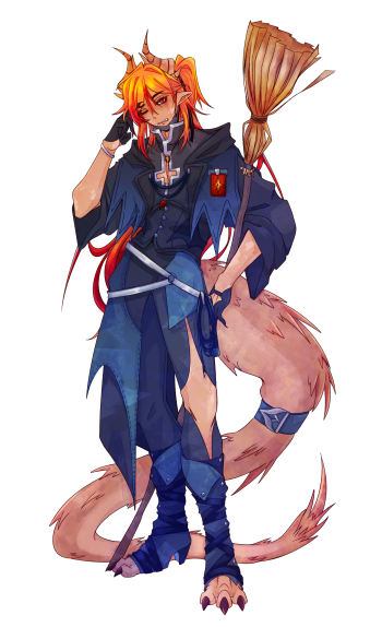 Emil dresses in an outfit similar to that of a priest, albeit stylised. The inner shirt is a long sleeved grey shirt with a cutout of an upside down cross in the middle paired together with a corset fashioned with bat wings. On top of that he wears a capelet that has dark blue gradient that fade to dark grey. His lower half is a half long coat, the left side being shorter while the right side is longer with bat wing motifs sewn into it. He wears dark grey pants, the left pant leg hanving a large cut off akin to that of a star. He wears a pair of tall button down boots wrapped in belts, the tip are exposed for him to freely move his clawed toes. Accessories wise, he wears his guild armband as a badge attached to his capelet, a bracelot on his right hand, a pair of gloves, a pull chain necklace with a red gem, a silver belt that hugs his hips where he can also attach his whip and a belt on his tail.
