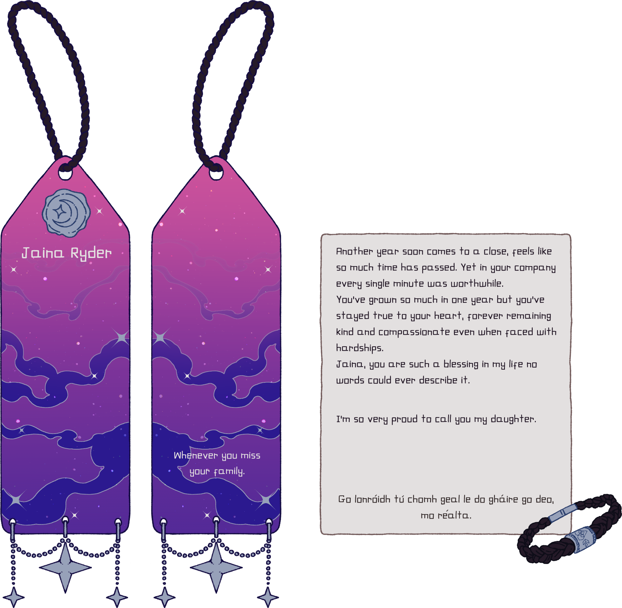 Delivered directly. Seems like there’s something else inside… a handmade leather bracelet. Black straps carefully braided together and a cylindrical piece of metal carved with patterns from Tírr. A symbol similar to a heart made out of straight lines in its middle, one that Jaina has seen time and time again before. One that Phel and his mother wear every day as a metal cuff woven into their braids, one that his father wears on a necklace close to his heart – the Argentum family insignia.