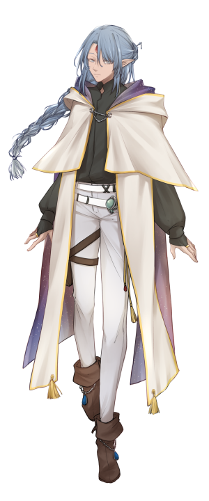 An Elvaari man with 178cm for height and a concerning amount of weight. He has a pale complexion and can often be seen with a very tired or uninterested expression on his face. He has a long blue-silver hair which he usually puts it in a braid. His silver coloured eyes appear to look very glass-like.